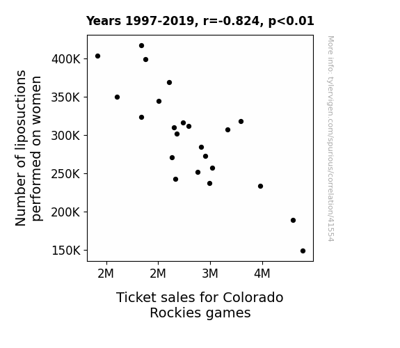 This means 68% of the change in the one variable (i.e., Ticket sales for Colorado Rockies games) is predictable based on the change in the other (i.e., Number of liposuctions performed on women) over the 23 years from 1997 through 2019.
