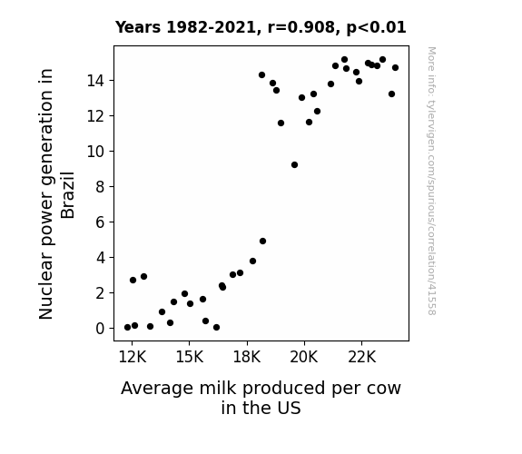 This means 82.5% of the change in the one variable (i.e., Average milk produced per cow in the US) is predictable based on the change in the other (i.e., Nuclear power generation in Brazil) over the 40 years from 1982 through 2021.