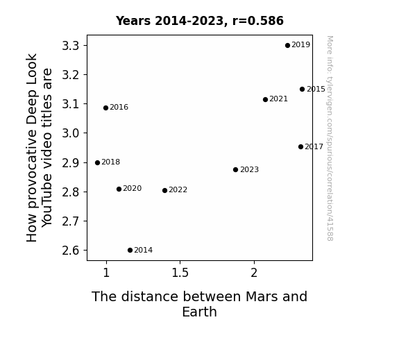 This means 34.3% of the change in the one variable (i.e., The distance between Mars and Earth) is predictable based on the change in the other (i.e., How provocative Deep Look YouTube video titles are) over the 10 years from 2014 through 2023.