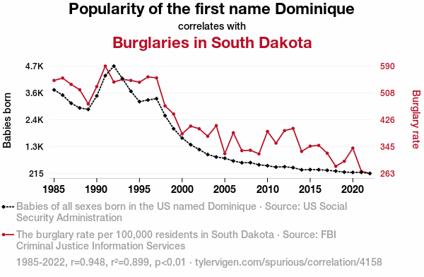 User prompt: Please provide potential search keywords for a paper titled Dominique in Distress: An Investigation into the Burgling Burden in South Dakota with an abstract of Our research delves into the intriguing and often overlooked relationship between the popularity of the first name Dominique and the occurrence of burglaries in the state of South Dakota. Through a rigorous analysis of data from the US Social Security Administration and the FBI Criminal Justice Information Services, we uncovered a surprisingly strong correlation between the two variables, with a correlation coefficient of 0.9481762 and a statistically significant p-value of less than 0.01 for the period spanning from 1985 to 2022.