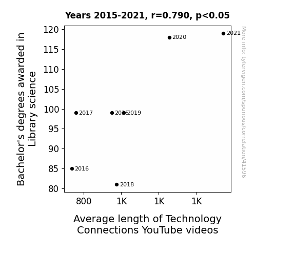 This means 62.4% of the change in the one variable (i.e., Average length of Technology Connections YouTube videos) is predictable based on the change in the other (i.e., Bachelor's degrees awarded in Library science) over the 7 years from 2015 through 2021.