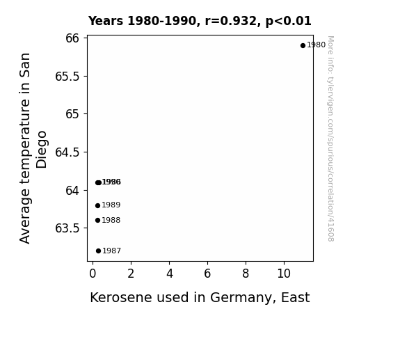 This means 86.9% of the change in the one variable (i.e., Kerosene used in Germany, East) is predictable based on the change in the other (i.e., Average temperature in San Diego) over the 6 years from 1980 through 1990.