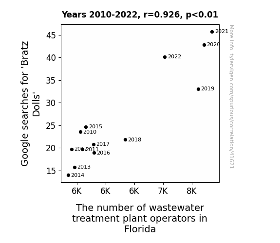 This means 85.8% of the change in the one variable (i.e., The number of wastewater treatment plant operators in Florida) is predictable based on the change in the other (i.e., Google searches for 'Bratz Dolls') over the 13 years from 2010 through 2022.