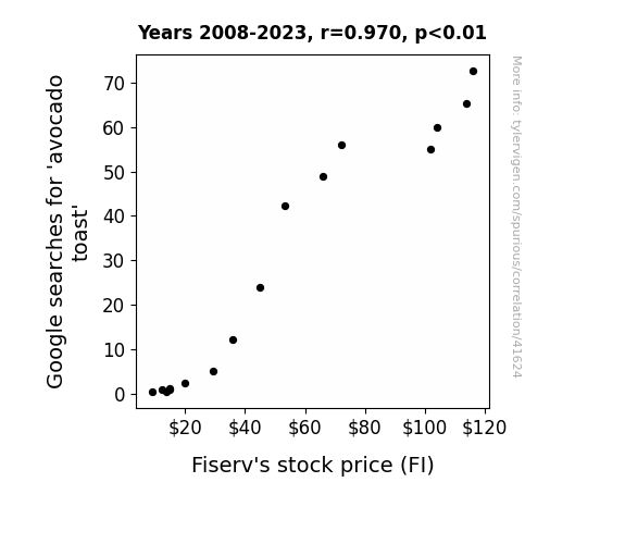 This means 94.1% of the change in the one variable (i.e., Fiserv's stock price (FI)) is predictable based on the change in the other (i.e., Google searches for 'avocado toast') over the 16 years from 2008 through 2023.