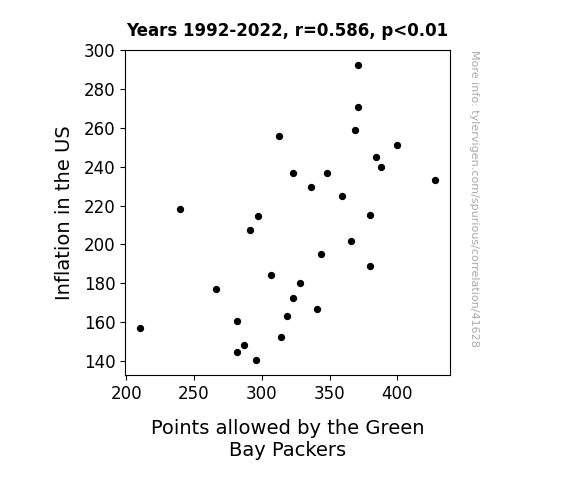 This means 34.4% of the change in the one variable (i.e., Points allowed by the Green Bay Packers) is predictable based on the change in the other (i.e., Inflation in the US) over the 31 years from 1992 through 2022.