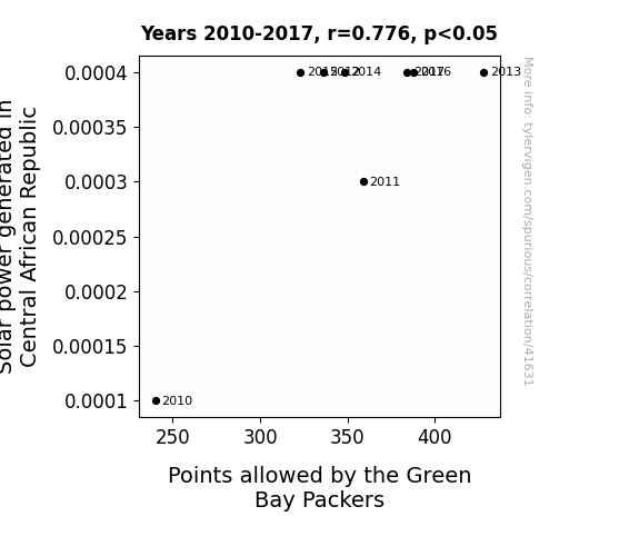 This means 60.2% of the change in the one variable (i.e., Points allowed by the Green Bay Packers) is predictable based on the change in the other (i.e., Solar power generated in Central African Republic) over the 8 years from 2010 through 2017.