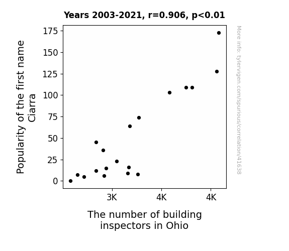 This means 82.1% of the change in the one variable (i.e., The number of building inspectors in Ohio) is predictable based on the change in the other (i.e., Popularity of the first name Ciarra) over the 19 years from 2003 through 2021.