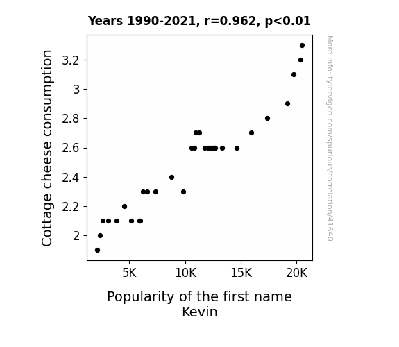 This means 92.6% of the change in the one variable (i.e., Popularity of the first name Kevin) is predictable based on the change in the other (i.e., Cottage cheese consumption) over the 32 years from 1990 through 2021.