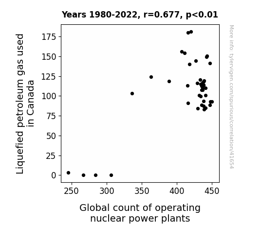 This means 45.8% of the change in the one variable (i.e., Global count of operating nuclear power plants) is predictable based on the change in the other (i.e., Liquefied petroleum gas used in Canada) over the 43 years from 1980 through 2022.