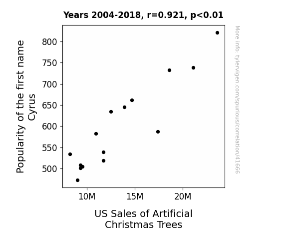 This means 84.8% of the change in the one variable (i.e., US Sales of Artificial Christmas Trees) is predictable based on the change in the other (i.e., Popularity of the first name Cyrus) over the 15 years from 2004 through 2018.