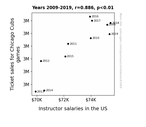 This means 78.5% of the change in the one variable (i.e., Instructor salaries in the US) is predictable based on the change in the other (i.e., Ticket sales for Chicago Cubs games) over the 11 years from 2009 through 2019.