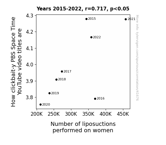 This means 51.4% of the change in the one variable (i.e., Number of liposuctions performed on women) is predictable based on the change in the other (i.e., How clickbait-y PBS Space Time YouTube video titles are) over the 8 years from 2015 through 2022.
