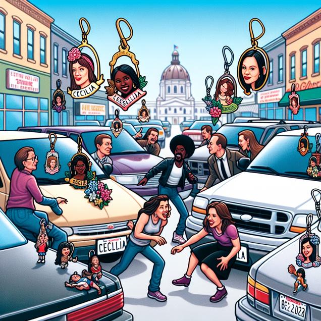 ChatGPT: Generate an image of a busy street scene in North Dakota, with a focus on cars adorned with personalized "Cecilia" car charms hanging from their rearview mirrors. As the scene unfolds, showcase some vehicles being targeted and stolen by criminals due to the popularity of these charms. The image should capture the contrasting emotions of joy and mischief related to the Cecilia car charms, reflecting the duality of the situation described.