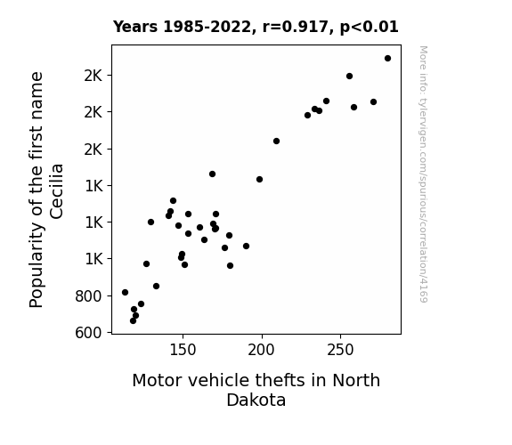 "Cecilia popularity North Dakota", "motor vehicle theft correlation Cecilia name", "statistical link Cecilia name car thefts", "Cecilia name and crime correlation", "North Dakota car theft analysis", "impact of Cecilia name on car thefts", "sociological study Cecilia and motor vehicle thefts", "Cecilia phenomenon in crime", "US Social Security Administration data analysis"