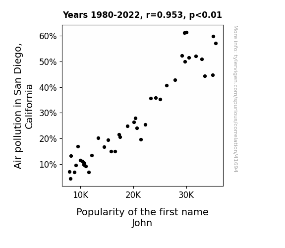 This means 90.8% of the change in the one variable (i.e., Popularity of the first name John) is predictable based on the change in the other (i.e., Air pollution in San Diego, California) over the 43 years from 1980 through 2022.