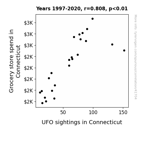 This means 65.3% of the change in the one variable (i.e., UFO sightings in Connecticut) is predictable based on the change in the other (i.e., Grocery store spend in Connecticut) over the 24 years from 1997 through 2020.