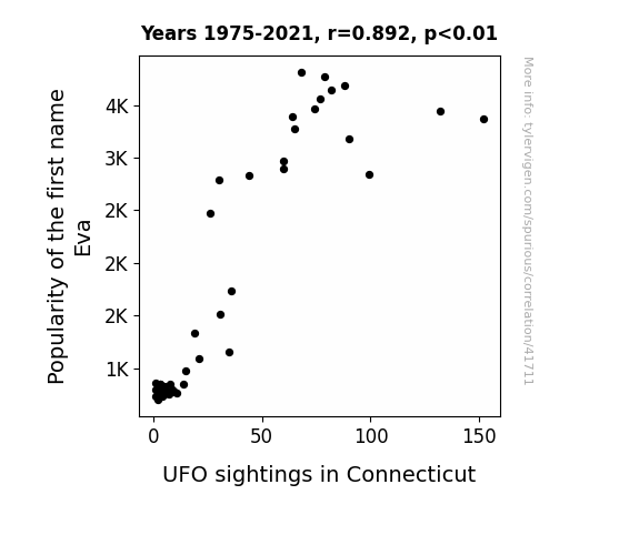 This means 79.6% of the change in the one variable (i.e., UFO sightings in Connecticut) is predictable based on the change in the other (i.e., Popularity of the first name Eva) over the 47 years from 1975 through 2021.