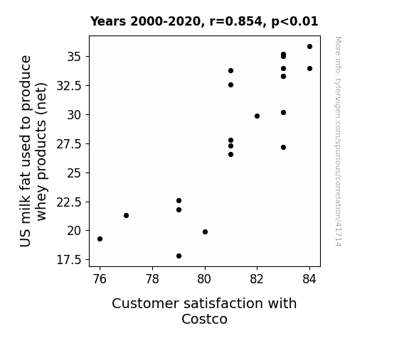 This means 73% of the change in the one variable (i.e., Customer satisfaction with Costco) is predictable based on the change in the other (i.e., US milk fat used to produce whey products (net)) over the 21 years from 2000 through 2020.