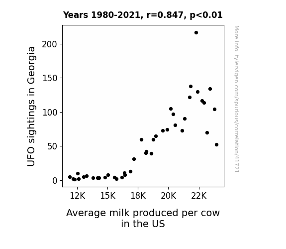 This means 71.8% of the change in the one variable (i.e., Average milk produced per cow in the US) is predictable based on the change in the other (i.e., UFO sightings in Georgia) over the 42 years from 1980 through 2021.