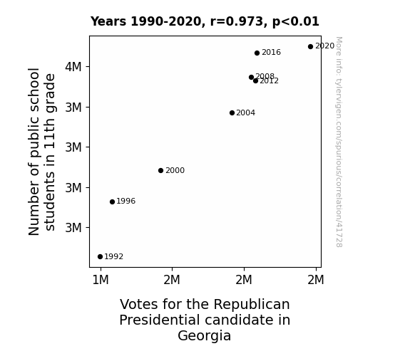 This means 94.7% of the change in the one variable (i.e., Votes for the Republican Presidential candidate in Georgia) is predictable based on the change in the other (i.e., Number of public school students in 11th grade) over the 8 years from 1990 through 2020.