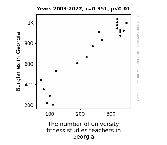 This means 90.5% of the change in the one variable (i.e., The number of university fitness studies teachers in Georgia) is predictable based on the change in the other (i.e., Burglaries in Georgia) over the 20 years from 2003 through 2022.