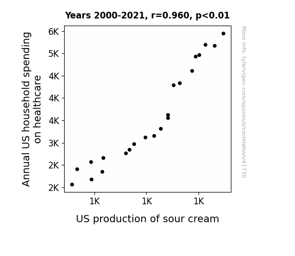 This means 92.1% of the change in the one variable (i.e., US production of sour cream) is predictable based on the change in the other (i.e., Annual US household spending on healthcare) over the 22 years from 2000 through 2021.