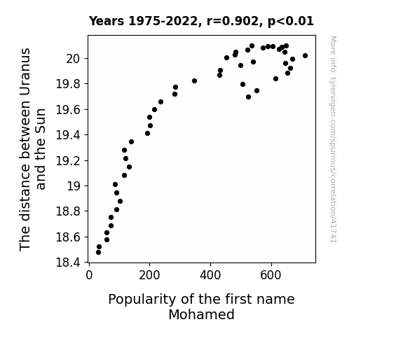 This means 81.4% of the change in the one variable (i.e., Popularity of the first name Mohamed) is predictable based on the change in the other (i.e., The distance between Uranus and the Sun) over the 48 years from 1975 through 2022.