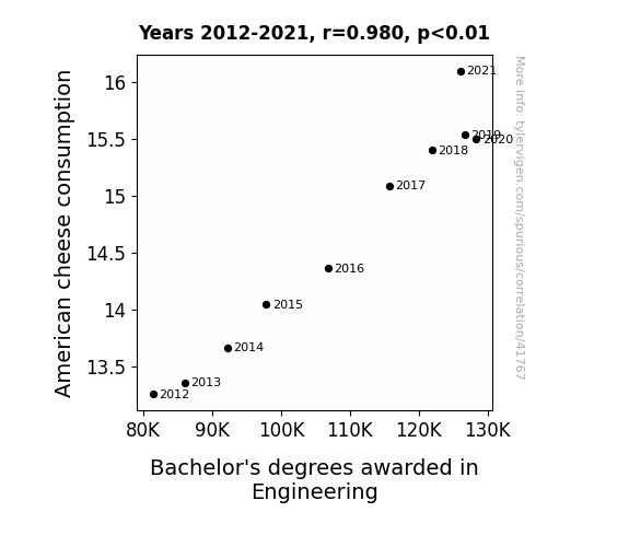 This means 96.1% of the change in the one variable (i.e., Bachelor's degrees awarded in Engineering) is predictable based on the change in the other (i.e., American cheese consumption) over the 10 years from 2012 through 2021.