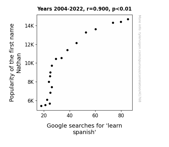 This means 81% of the change in the one variable (i.e., Google searches for 'learn spanish') is predictable based on the change in the other (i.e., Popularity of the first name Nathan) over the 19 years from 2004 through 2022.