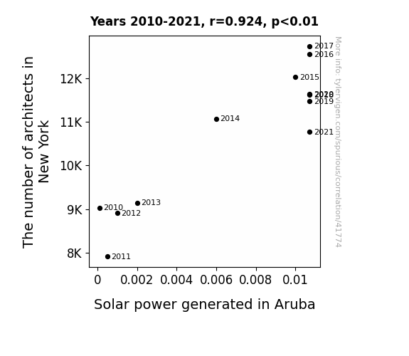 This means 85.3% of the change in the one variable (i.e., Solar power generated in Aruba) is predictable based on the change in the other (i.e., The number of architects in New York) over the 12 years from 2010 through 2021.