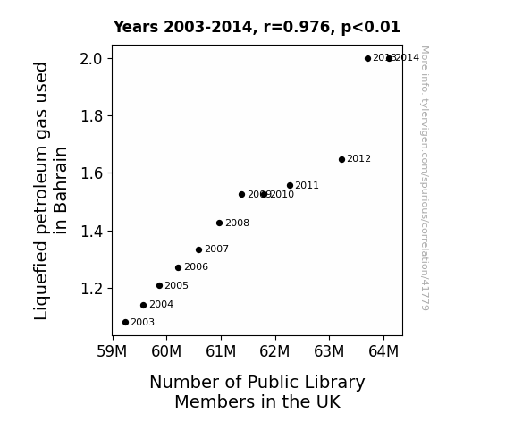 This means 95.2% of the change in the one variable (i.e., Number of Public Library Members in the UK) is predictable based on the change in the other (i.e., Liquefied petroleum gas used in Bahrain) over the 12 years from 2003 through 2014.