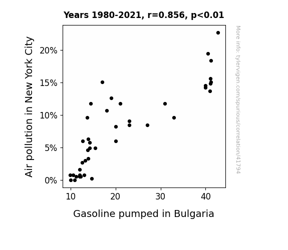 This means 73.2% of the change in the one variable (i.e., Gasoline pumped in Bulgaria) is predictable based on the change in the other (i.e., Air pollution in New York City) over the 42 years from 1980 through 2021.