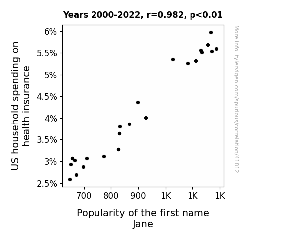This means 96.4% of the change in the one variable (i.e., Popularity of the first name Jane) is predictable based on the change in the other (i.e., US household spending on health insurance) over the 23 years from 2000 through 2022.