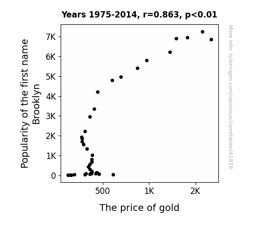 This means 74.5% of the change in the one variable (i.e., The price of gold) is predictable based on the change in the other (i.e., Popularity of the first name Brooklyn) over the 40 years from 1975 through 2014.