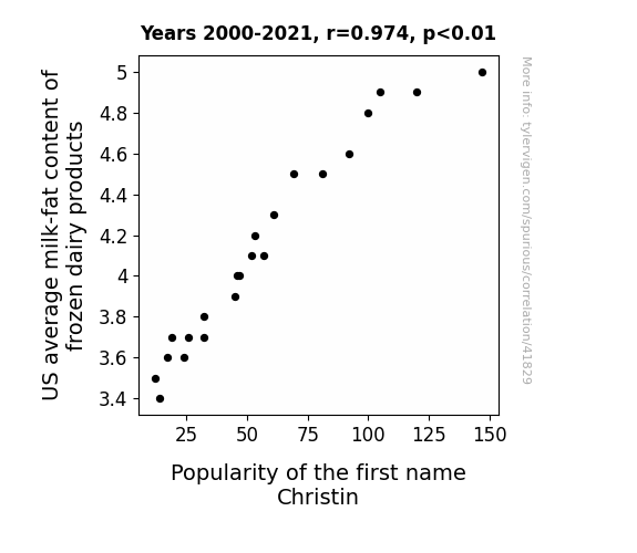 This means 94.8% of the change in the one variable (i.e., Popularity of the first name Christin) is predictable based on the change in the other (i.e., US average milk-fat content of frozen dairy products) over the 22 years from 2000 through 2021.