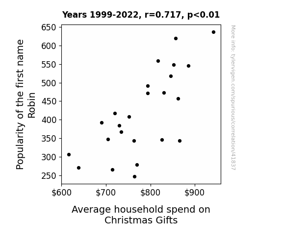 This means 51.4% of the change in the one variable (i.e., Average household spend on Christmas Gifts) is predictable based on the change in the other (i.e., Popularity of the first name Robin) over the 24 years from 1999 through 2022.