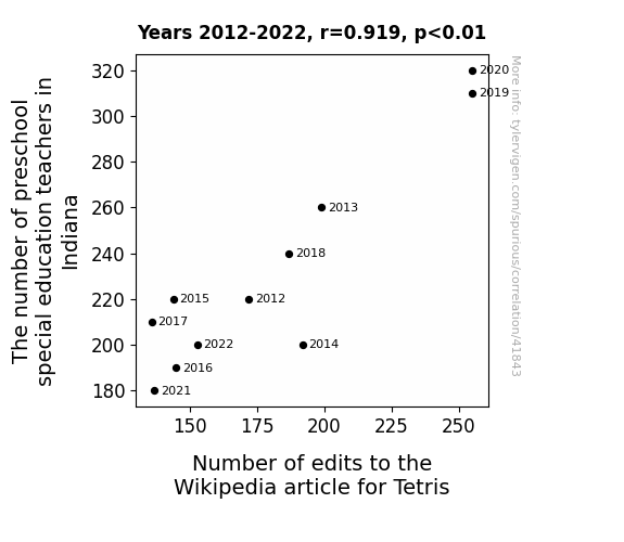 This means 84.4% of the change in the one variable (i.e., Number of edits to the Wikipedia article for Tetris) is predictable based on the change in the other (i.e., The number of preschool special education teachers in Indiana) over the 11 years from 2012 through 2022.