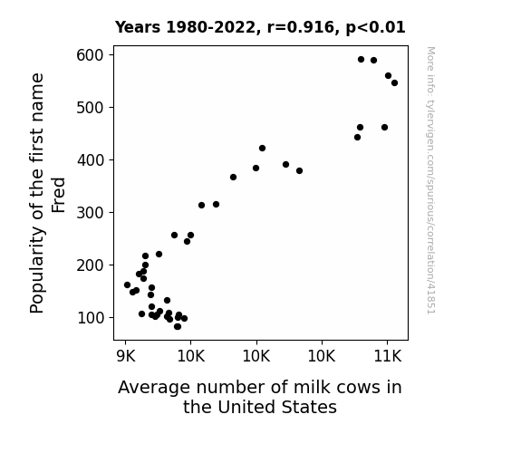 This means 83.9% of the change in the one variable (i.e., Average number of milk cows in the United States) is predictable based on the change in the other (i.e., Popularity of the first name Fred) over the 43 years from 1980 through 2022.
