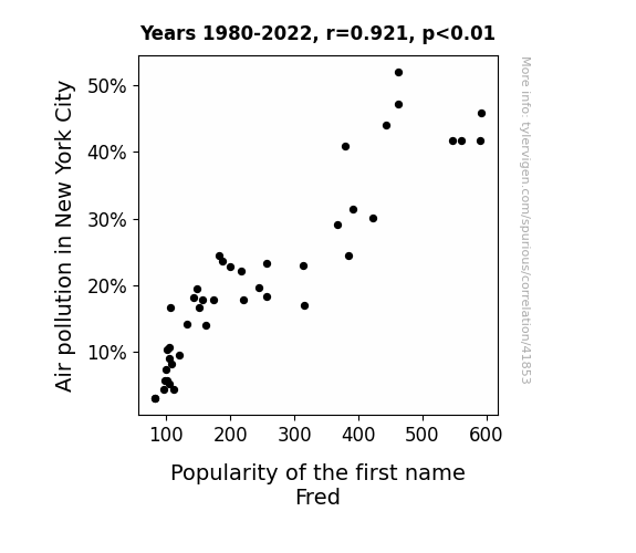 This means 84.8% of the change in the one variable (i.e., Popularity of the first name Fred) is predictable based on the change in the other (i.e., Air pollution in New York City) over the 43 years from 1980 through 2022.