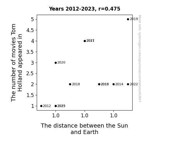 This means 22.5% of the change in the one variable (i.e., The distance between the Sun and Earth) is predictable based on the change in the other (i.e., The number of movies Tom Holland appeared in) over the 12 years from 2012 through 2023.