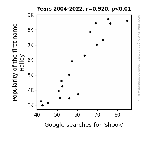 This means 84.7% of the change in the one variable (i.e., Google searches for 'shook') is predictable based on the change in the other (i.e., Popularity of the first name Hailey) over the 19 years from 2004 through 2022.