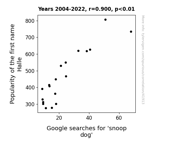 This means 81% of the change in the one variable (i.e., Google searches for 'snoop dog') is predictable based on the change in the other (i.e., Popularity of the first name Halle) over the 19 years from 2004 through 2022.