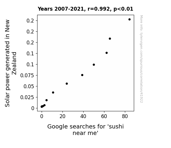 This means 98.4% of the change in the one variable (i.e., Google searches for 'sushi near me') is predictable based on the change in the other (i.e., Solar power generated in New Zealand) over the 15 years from 2007 through 2021.
