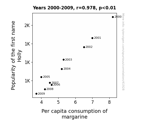 This means 95.7% of the change in the one variable (i.e., Per capita consumption of margarine) is predictable based on the change in the other (i.e., Popularity of the first name Holly) over the 10 years from 2000 through 2009.