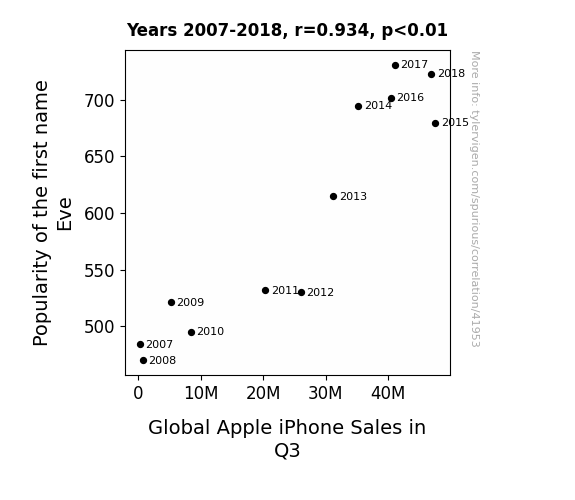 This means 87.2% of the change in the one variable (i.e., Global Apple iPhone Sales in Q3) is predictable based on the change in the other (i.e., Popularity of the first name Eve) over the 12 years from 2007 through 2018.