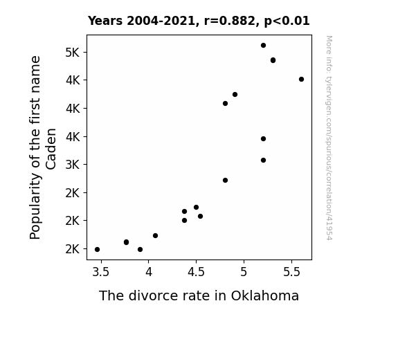 This means 77.8% of the change in the one variable (i.e., The divorce rate in Oklahoma) is predictable based on the change in the other (i.e., Popularity of the first name Caden) over the 18 years from 2004 through 2021.