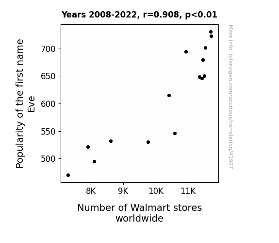 This means 82.5% of the change in the one variable (i.e., Number of Walmart stores worldwide) is predictable based on the change in the other (i.e., Popularity of the first name Eve) over the 15 years from 2008 through 2022.