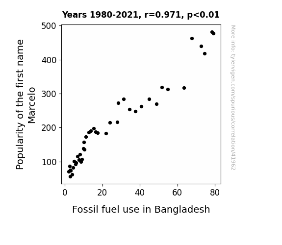 This means 94.3% of the change in the one variable (i.e., Fossil fuel use in Bangladesh) is predictable based on the change in the other (i.e., Popularity of the first name Marcelo) over the 42 years from 1980 through 2021.
