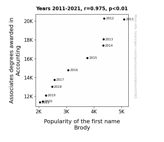This means 95% of the change in the one variable (i.e., Popularity of the first name Brody) is predictable based on the change in the other (i.e., Associates degrees awarded in Accounting) over the 11 years from 2011 through 2021.