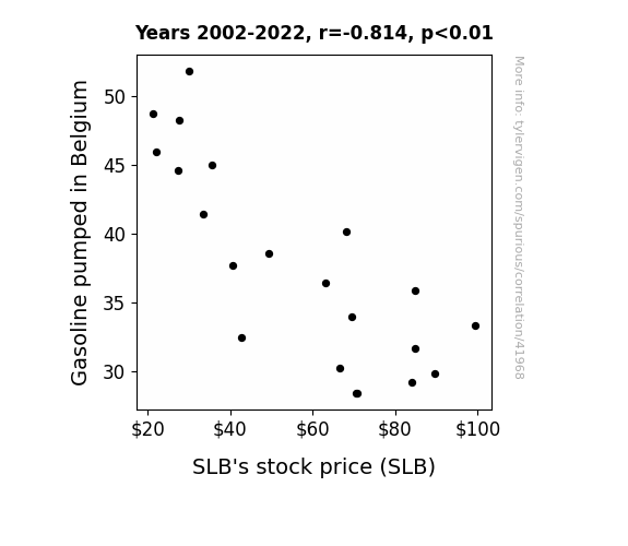 This means 66.3% of the change in the one variable (i.e., SLB's stock price (SLB)) is predictable based on the change in the other (i.e., Gasoline pumped in Belgium) over the 21 years from 2002 through 2022.